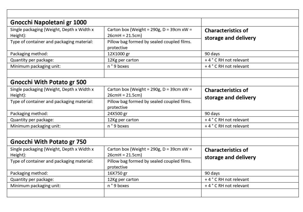 Ingredients: Flour type “00 / G” Water, dehydrated potatoes (containing emulsifying mono and glycerides of fatty acids of vegetable origin and: coza oil), potatoes, corn starch, salt. Preservative E 200 E 330 acidity regulator